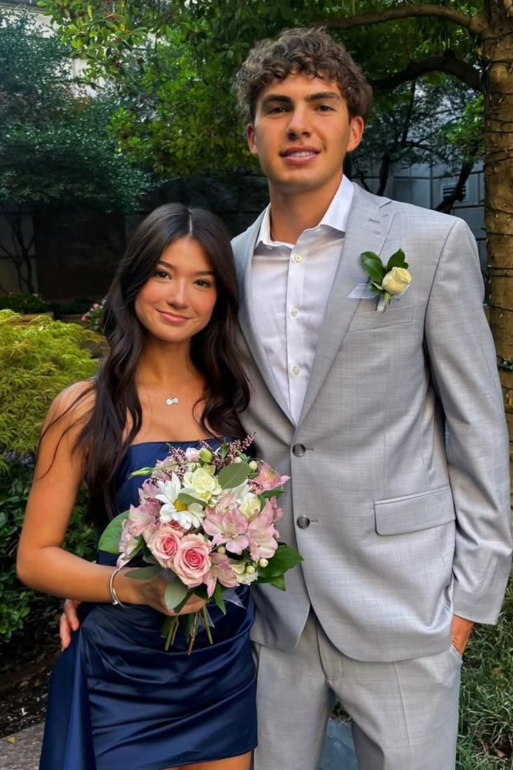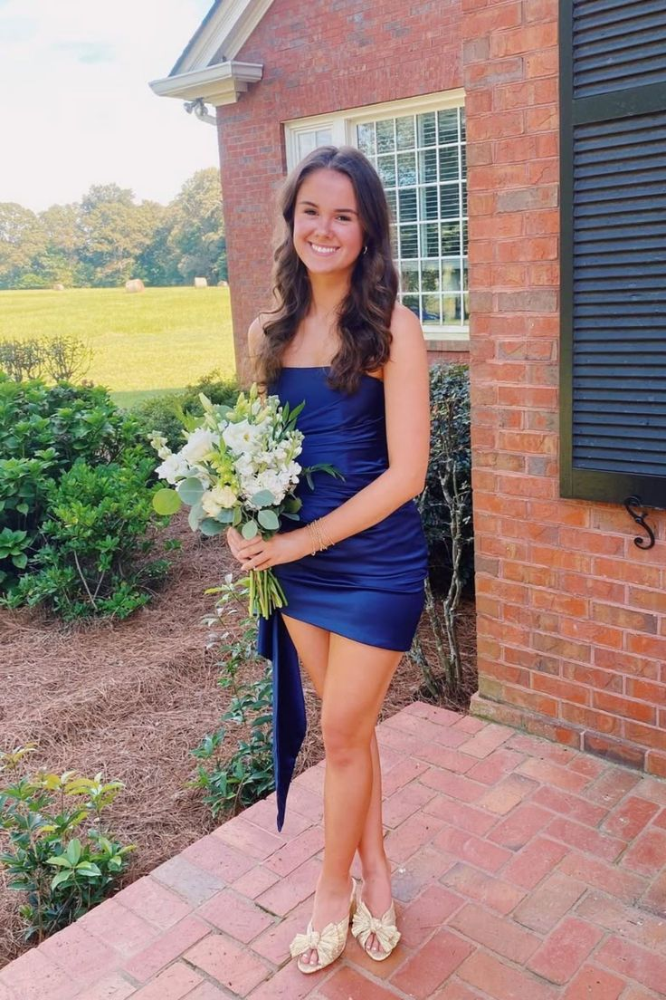 Trägerloses, marineblaues, kurzes Etuikleid für den Heimkehrer J7271