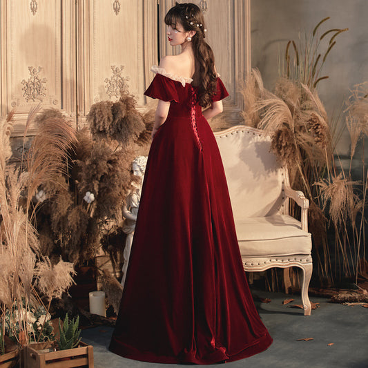 Off Shoulder Burgundy Long Prom Dress A Line Velvet Evening Gown 566