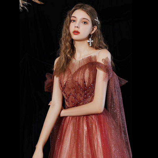 Burgundy A Line Tulle Prom Dress Shiny Formal Evening Gown 571