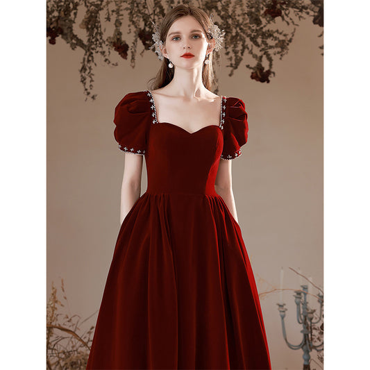 Sweetheart A Line Long Prom Dress Puff Sleeves Velvet Burgundy Evening Gown 574