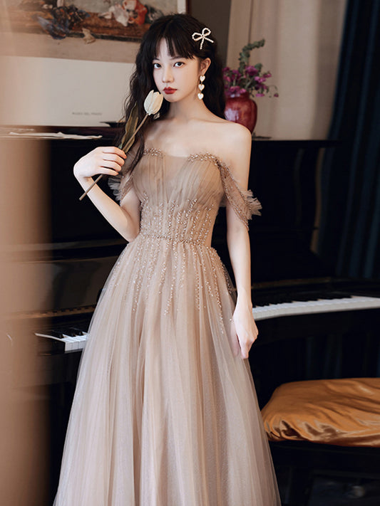 Champagne A Line Tulle Prom Dress Spaghetti Strap Evening Formal Gown 307