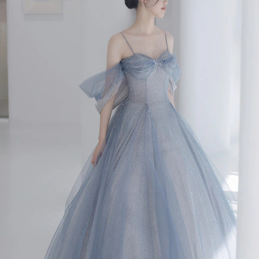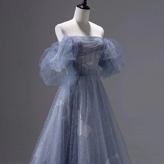 Blue Off Shoulder Tulle Long Prom Dress A Line Formal Evening Party Gown 321