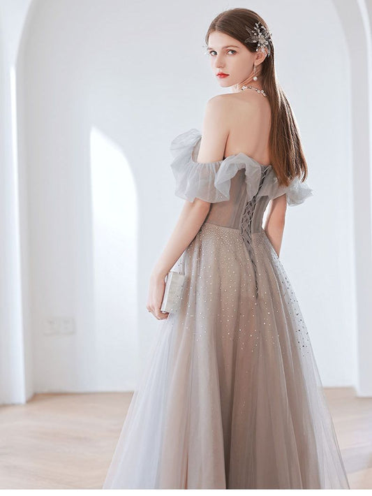 Off Shoulder Gray Sequins Long Prom Dress A Line Tulle Formal Evening Gown 305