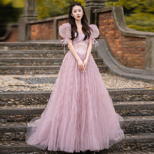 Pink A Line Tulle Prom Dress Puff Sleeves Sweet Princess Party Gown 311