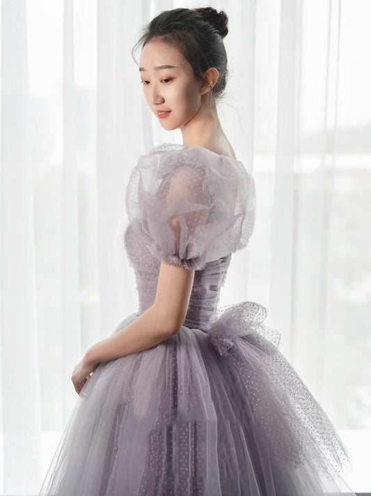 Violet Tulle A Line Long Prom Dress Puff Sleeves Formal Party Gown 310