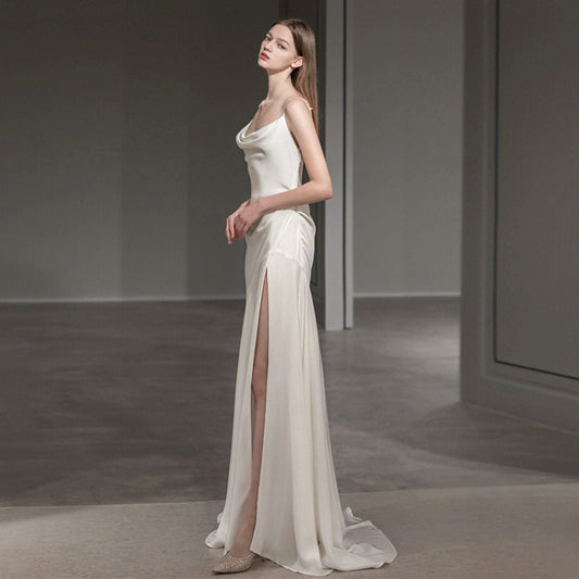 French Spaghetti Strap Long Prom Dress White Satin V back Wedding Dress 178