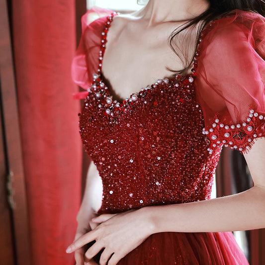 Red Short Sleeves Prom Dress Beaded Long Evening Gown Formal Dress 71