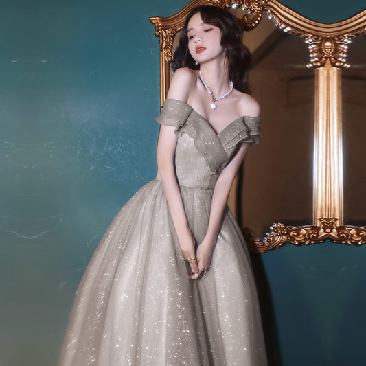Off Shoulder Long Prom Dress Gray Sparkly Evening Dress 56