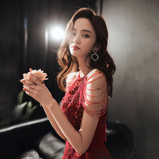 Burgundy Tulle Prom Dress Beading Evening Dress 43