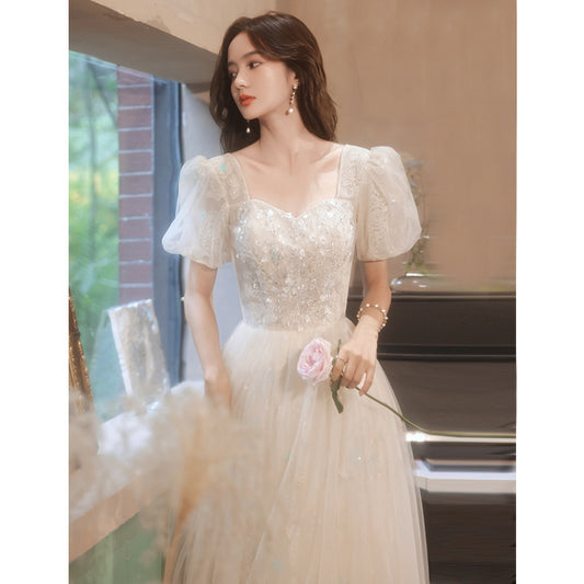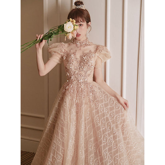 Sequins Long Prom Dress Short Sleeves Tulle Evening Dress 16