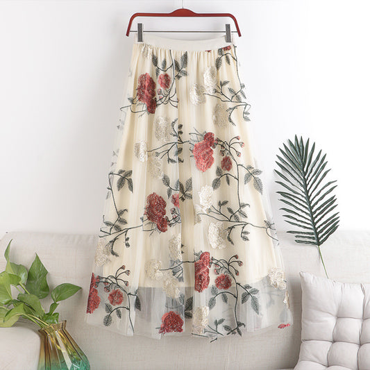 Mesh Embroidered Floral Skirt A-line Mid-length Skirt 734