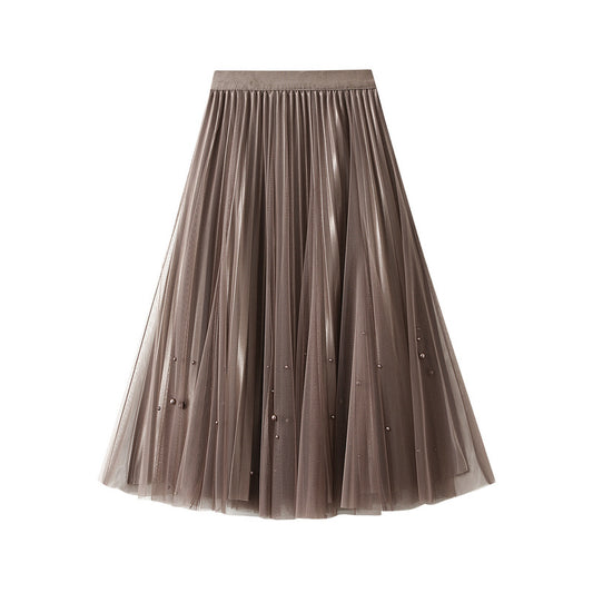 Beaded Mesh High Waist Skirt Fairy Pleated Skirt Mid-length A-line Skirt 731