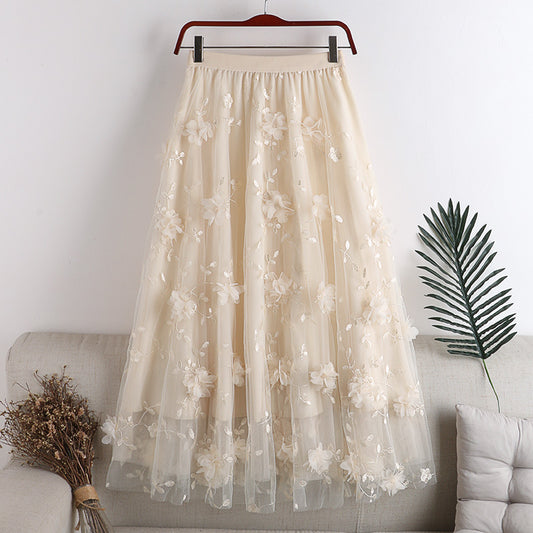 High-waist Mesh Large Swing A-line Skirt 3D Embroidery Flower Mid-length Skirt 733
