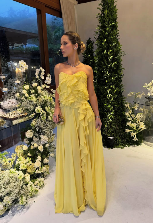 Yellow Ruffle Long Prom Dress Chiffon Wedding Guest Dress J9165
