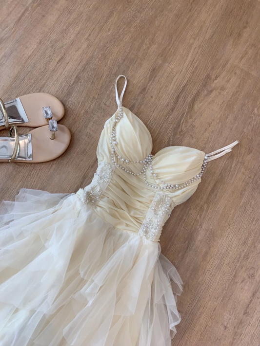 Robe de bal à bretelles spaghetti, en tulle et à volants, robe de soirée trapèze perlée J8805
