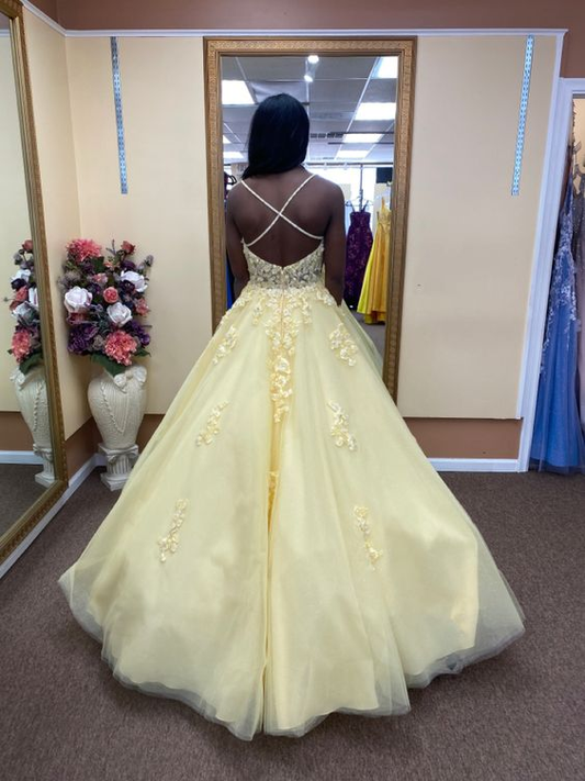 Robe de bal longue en tulle jaune à bretelles spaghetti et coupe trapèze J2623