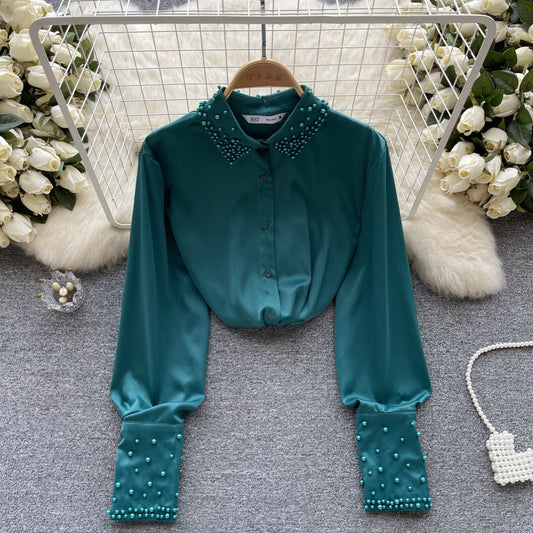 Chemise en mousseline de soie perlée pour femme, nouvelle collection printemps 2023, chemise française à manches longues en satin 336