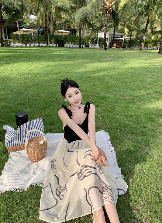 Jupe longue de plage imprimée noire et blanche, nouvelle collection été 2023, robe de vacances en bord de mer, 70