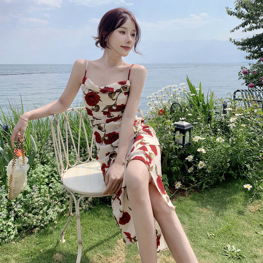 Robe longue d'été française 2023, robe de vacances à bretelles florales, robe longue de plage 69