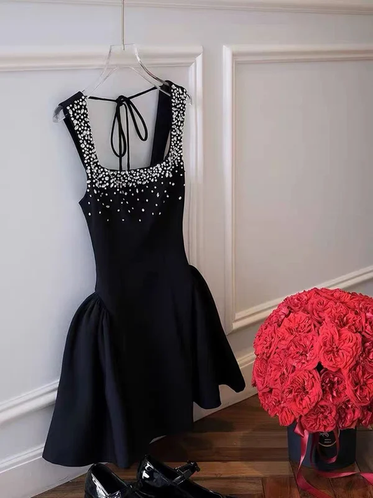 Robe de soirée courte à col en V et licou, coupe trapèze, J4193