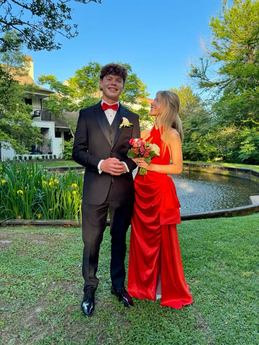 Robe de soirée longue en satin rouge coupe trapèze avec fente latérale J6735