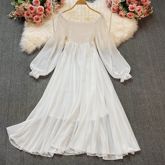 Jupe trapèze longue blanche à col carré en mousseline de soie 977