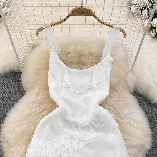 Robe blanche à bretelles spaghetti en mousseline de soie, robe longue de plage féerique pour les vacances L4