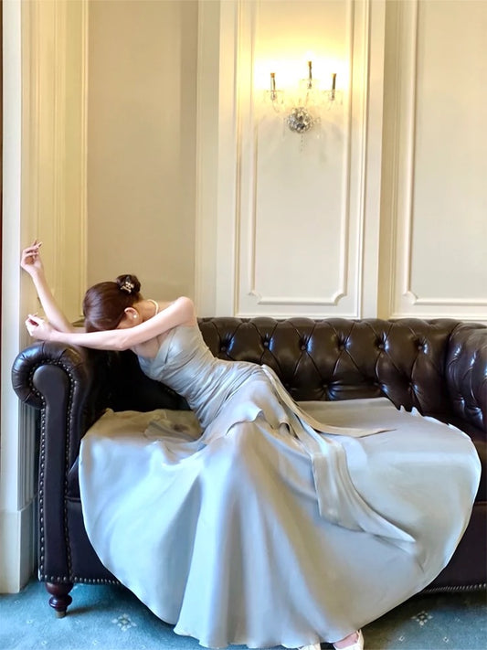 Robe de bal trapèze à bretelles spaghetti, gris et bleu, en satin, tenue d'anniversaire, J6612