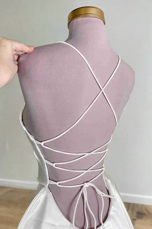 Robe de soirée moulante en satin à bretelles spaghetti et col en V J6972