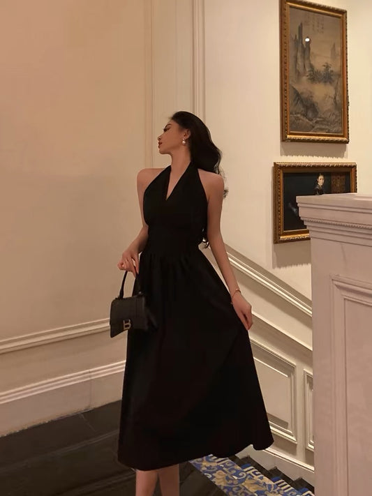 Robe de soirée noire à col en V et coupe trapèze J3284