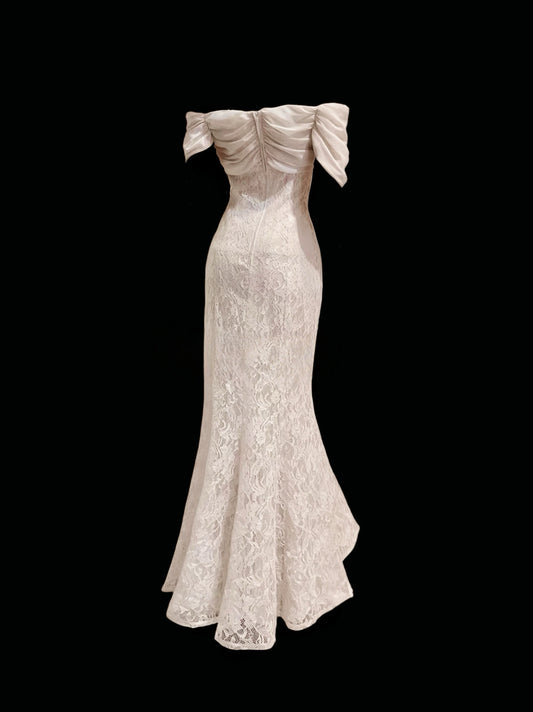 Robe de soirée longue en dentelle style sirène à épaules dénudées J8426