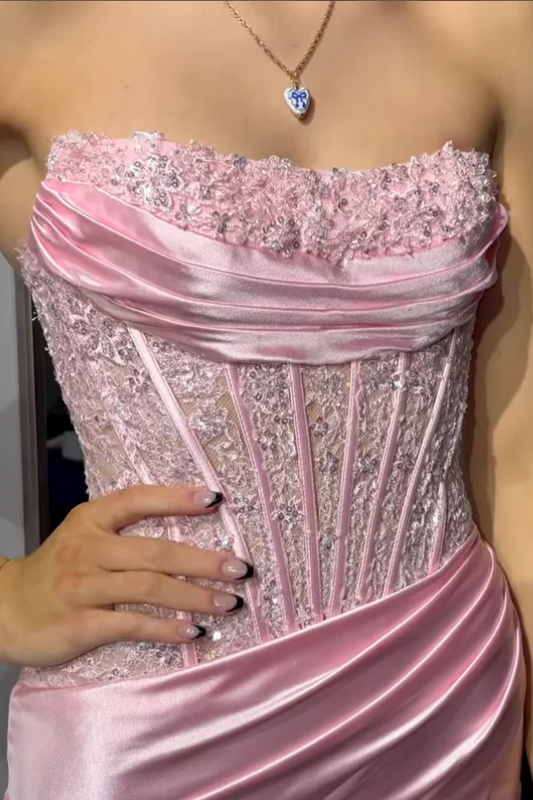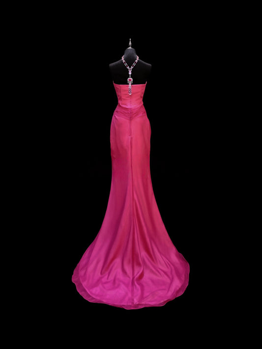Robe de bal longue en satin rose à bretelles spaghetti et sirène J8308
