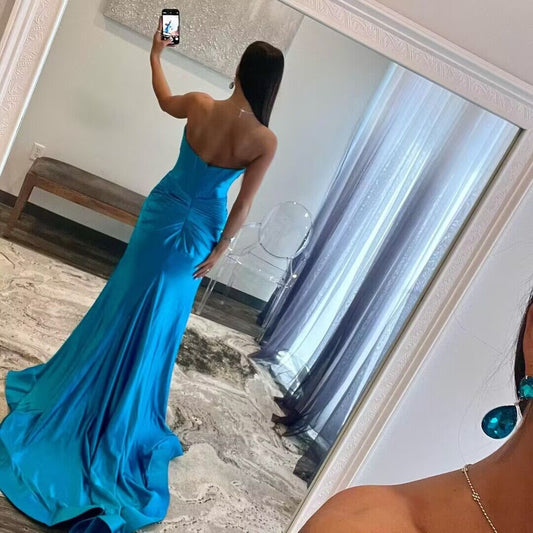 Robe de bal longue sirène bleue sans bretelles avec fente J2872