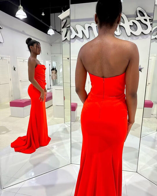 Robe de bal longue sirène en mousseline de soie orange sans bretelles J2842