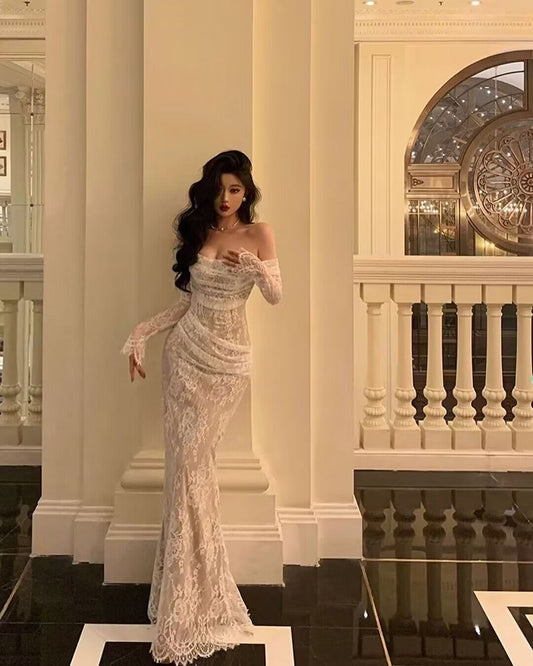 Robe de bal longue sirène en dentelle à épaules dénudées J2849
