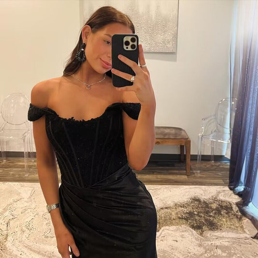 Robe de bal longue noire style sirène à épaules dénudées et fente J2822