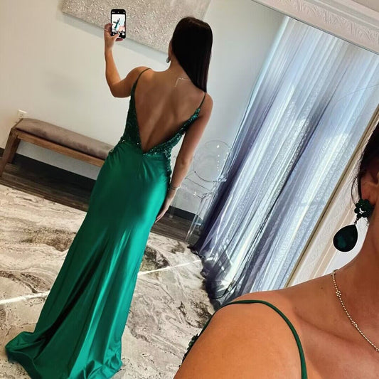 Robe de bal sirène longue en satin vert à bretelles spaghetti et appliqués J2819