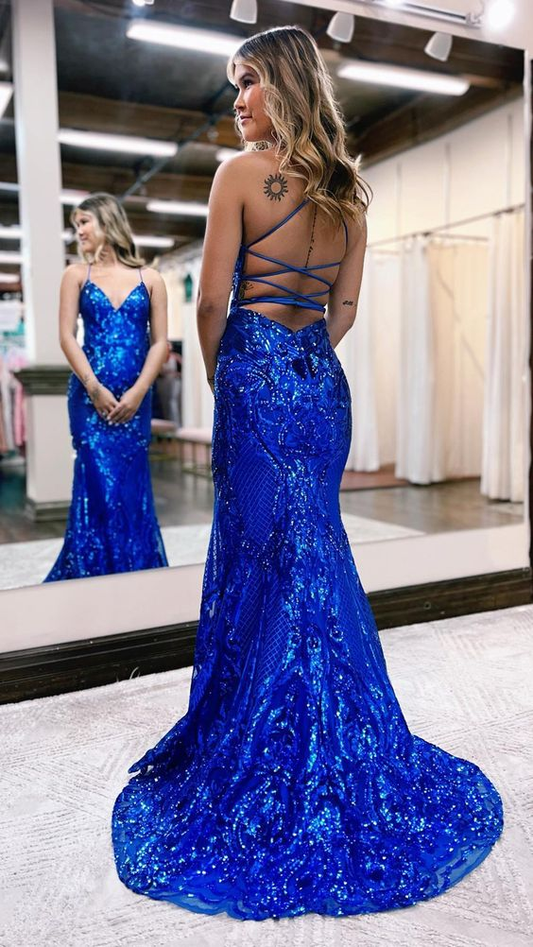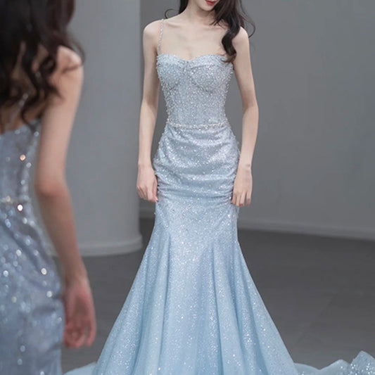 Robe de soirée sirène longue à bretelles spaghetti et paillettes bleues avec fente 259