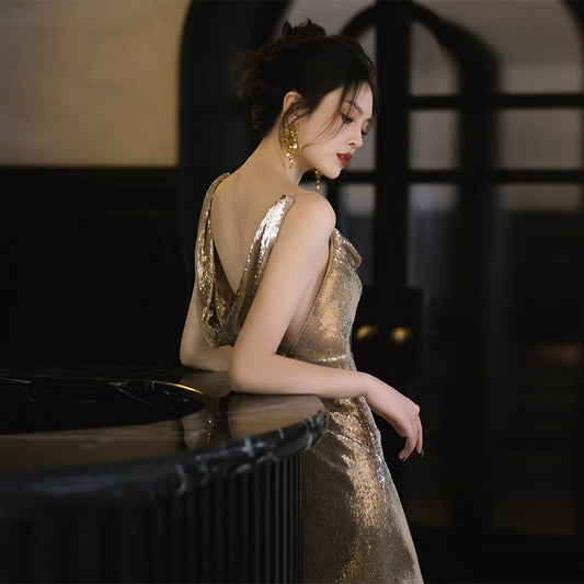 Robe de soirée sirène à paillettes dos nu 1972