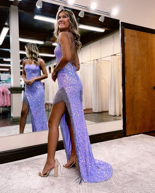 Robe de bal longue lavande à col en V et paillettes scintillantes avec fente 2164