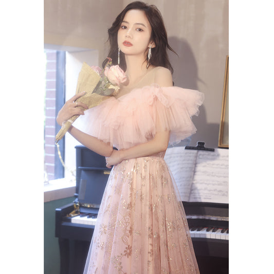 Robe de bal en tulle rose à épaules dénudées, jolie robe de soirée 680