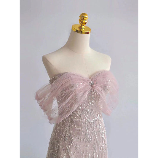 Robe de bal rose à épaules dénudées et paillettes, tenue de soirée princesse 666
