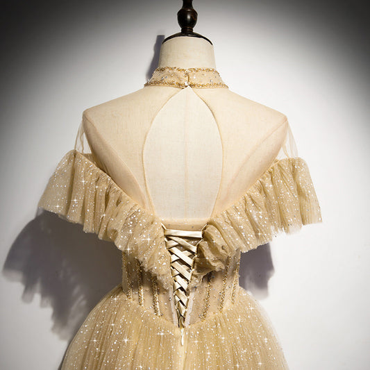 Robe de soirée longue scintillante à épaules dénudées, couleur champagne doré, 203