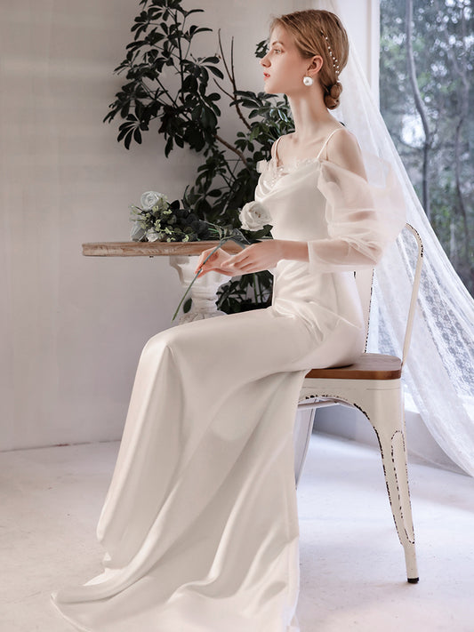 Robe de mariée blanche simple à manches longues et dos en V, robe de soirée longue 191