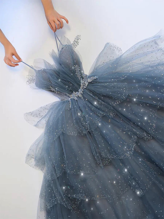 Robe de bal longue en tulle bleu à paillettes, robe de soirée longue scintillante 193