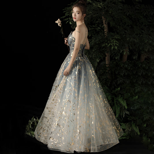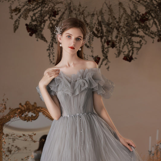 Robe de bal longue en tulle gris, épaules dénudées, robe de soirée, robe de soirée, 171