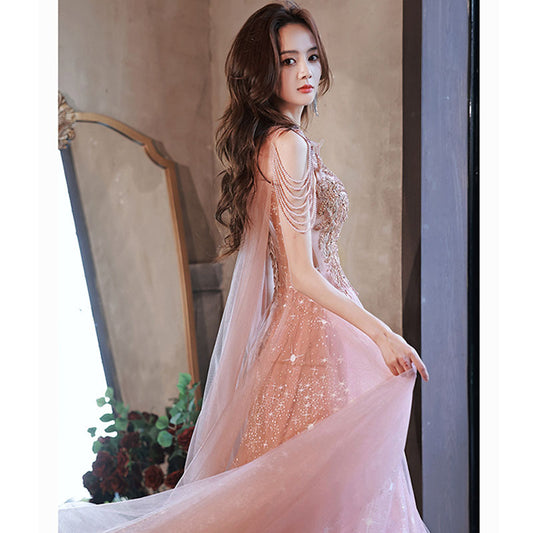 Robe de bal longue rose à perles, robe de soirée à col en V, avec bonnet, 76