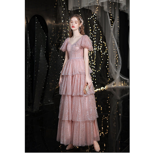 Robe de bal longue rose scintillante à manches courtes et robe de soirée scintillante 77