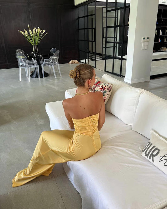 Robe fourreau jaune longue à bretelles spaghetti, robe de bal J2722