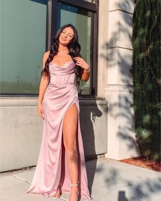 Robe de bal fourreau longue en satin rose avec fente J2636